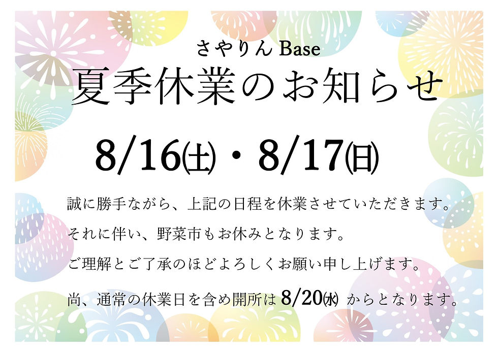 さやりんBaseは8月16日(土)、8月17(日)の二日間を夏季休暇として閉館させていただきます。